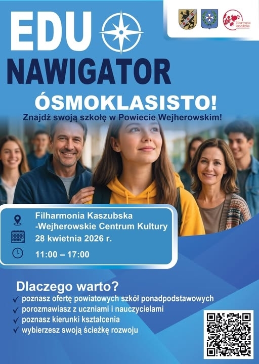 Już 28 kwietnia 2026 r. w Filharmonii Kaszubskiej – Wejherowskim Centrum Kultury, w godzinach 11:00–17:00, odbędzie się „Edu Nawigator – znajdź swoją szkołę w Powiecie Wejherowskim”!