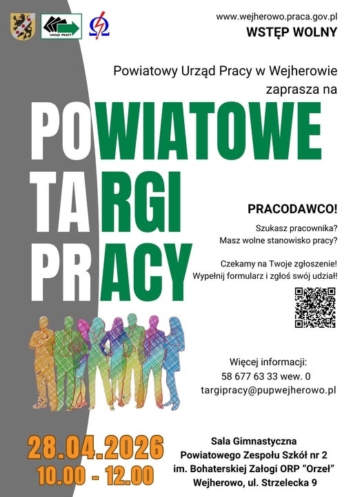 Powiatowy Urząd Pracy zaprasza na Powiatowe Targi Pracy, które odbędą się 28 kwietnia w godzinach 10:00–12:00. Wydarzenie odbędzie się w sali gimnastycznej Powiatowego Zespołu Szkół nr 2 w Wejherowie przy ul. Strzeleckiej 9.