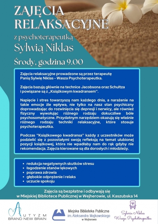 Zajęcia relaksacyjne z psychoterapeutką Sylwią Niklas Zapraszamy na bezpłatne zajęcia relaksacyjne prowadzone przez psychoterapeutkę Sylwię Niklas. Spotkania odbywają się w każdą środę o godz. 9:00 w Miejskiej Bibliotece Publicznej w Wejherowie.W programie: ćwiczenia relaksacyjne oparte na technikach Jacobsona i Schultza, „Książkowy kwadrans” – czas na wymianę refleksji o książkach, które warto przeczytać.Zajęcia pomagają redukować stres i napięcie, wpływają korzystnie na zdrowie psychiczne i fizyczne.